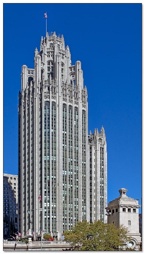 这是高居全美发行量第三位的《芝加哥论坛报》的本部,外墙嵌有一面铜板,刻有论坛报曾刊载过的世界各国建筑物的缩影及重大的历史消息。大厦的大厅内则有一个石屏风,刻有《伊索寓言》中的形象,墙上更刻有名人名言。这栋大厦建于1922年,俯瞰美丽的河流和繁华的Michigan Avenue大道。大厦的建筑设计灵感来源于法国和比利时两座著名教堂的哥特式塔顶。大厦基础建筑则嵌有来自全美及全球知名地方的石头,这也是芝加哥一景。