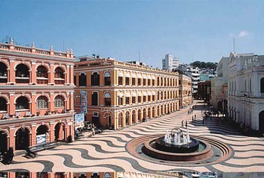 澳门的中心地带-议事亭前地,地上铺砌着波浪型葡萄牙黑白碎石,仿如大浪滔滔的海洋。因为广场中央有一座喷水池,议事亭前地以前被称为喷水池,现在仍有不少澳门老居民仍沿用此名称。现今,喷水池上摆放着象征葡萄牙航海远征的天球仪,晚上配上灯光效果让议事亭前地颇有魅力。周围有青葱的植物和供人休憩的长椅。